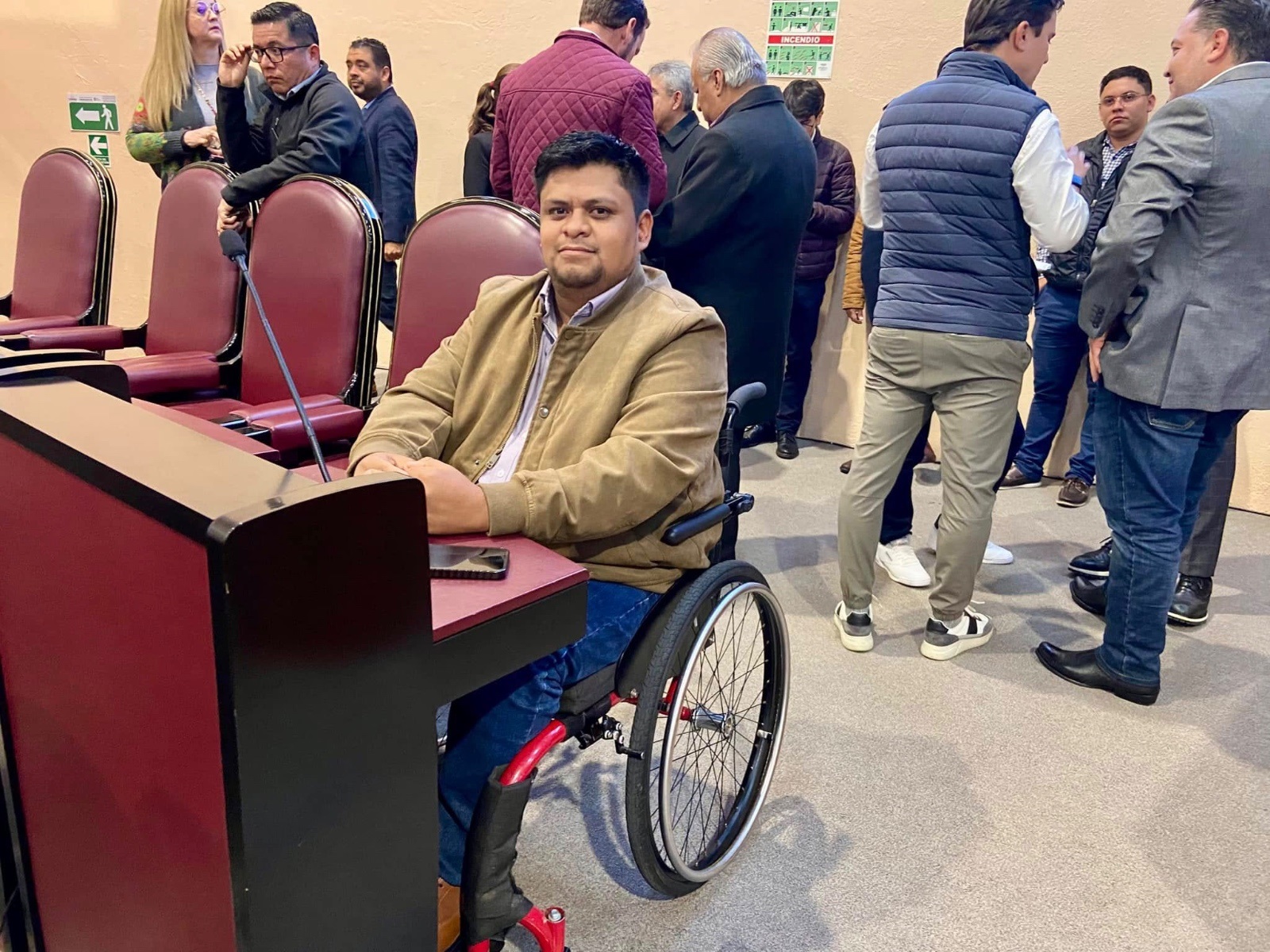 Omar Edmundo es el primer diputado en el Congreso local con una discapacidad. Llega a la curul vía Morena. Pasa sin ningún problema con su silla de ruedas por los pasillos del Palacio Legislativo apoyado por Cristian, persona de sus confianzas, quien desde que sufrió el accidente, lo viene acompañando.