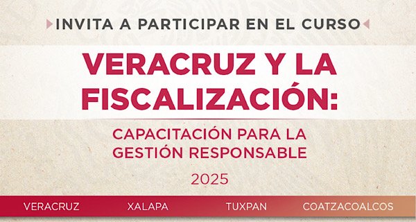 Este 24 de marzo, el Palacio Legislativo será sede del curso Veracruz y la Fiscalización: Capacitación para una Gestión Responsable 2025, dirigido a las y los servidores públicos municipales de la entidad y organizado por este Congreso, a través de la Secretaría de Fiscalización y la Dirección de Auditoría y Revisión Financiera, y la Contraloría General del Estado (CGE).
