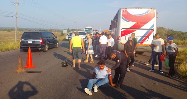 El motociclista tuvo la mala fortuna de chocar con un autobús de pasaje Los Tuxtlas, dejando su unidad debajo de la llanta del autobús; al sitio acudió la Unidad Médica de Protección Civil de Alvarado, la cual y atención al joven que presentaba fractura de tobillo con exposición y hemorragia activa, además de contusión frontal, todo esto en su lado izquierdo.