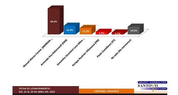 Córdoba: De acuerdo con una encuesta levantada por el Grupo Consultor Santoyo, el candidato del partido Movimiento Regeneración Nacional (Morena), Manuel Alonso Cerezo, se perfila como el favorito en la contienda por la Presidencia Municipal de Córdoba, con una amplia ventaja sobre su más cercano contendiente.
