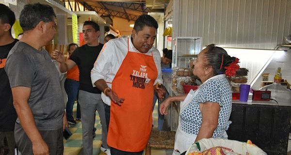 Como parte de su jornada, el aspirante visitó el mercado Adolfo Ruiz Cortines, conocido como “La Rotonda”, donde dialogó con locatarios y comerciantes, y se comprometió a mejorar las condiciones del espacio, reconociendo la importancia de este centro para la economía local.