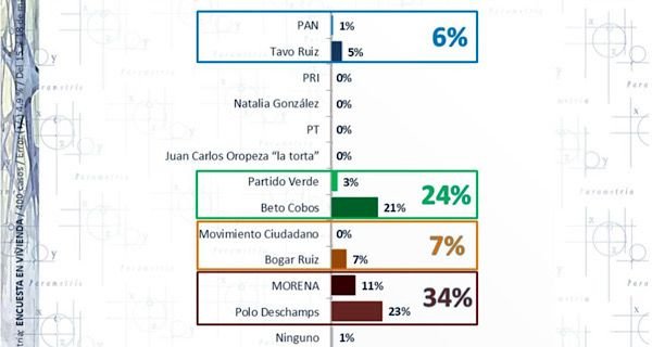 Según esta medición realizada cara a cara en vivienda a 400 ciudadanos con edad de votar y con credencial de elector vigente, el candidato de Morena, Polo Deschamps, obtiene el 34 por ciento de las preferencias ciudadanas, seguido por el candidato del partido Verde, Beto Cobos, con un 24 por ciento.