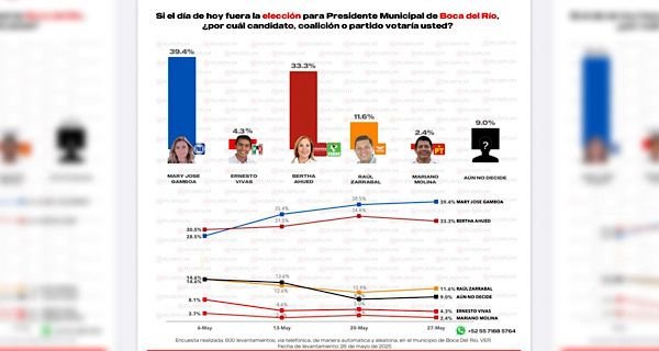 En ese sentido, la prestigiosa casa encuestadora Rubrum, que ha sido incluso la empresa que ha utilizado Morena para darle seguimiento a las preferencias en la actual elección de Boca del Río, marca una ventaja irreversible de más de 6 puntos de la candidata del PAN a la alcaldía, Maryjose Gamboa, sobre el aspirante que ocupa el segundo lugar.