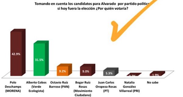 De acuerdo a la medición realizada cara a cara en vivienda a 500 ciudadanos en edad de votar, el morenista Polo Deschamps obtuvo el 42.9 por ciento de las preferencias electorales, en segundo lugar Beto Cobos del Partido Verde, obtuvo el 31.5 por ciento de la intención del voto.