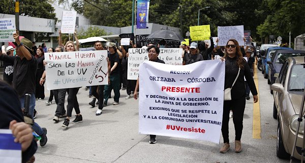 Cientos de miembros de la comunidad de la Universidad Veracruzana(UV) mostraron su enojo por la imposición de la prorroga otorgada al rector Martín Aguilar Sánchez, además pidieron que el Senador Manuel Huerta saque las manos del proceso.