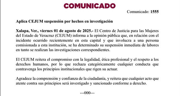 El Centro de Justicia para las Mujeres de Veracruz (CEJUM) anunció la suspensión inmediata de una persona comisionada a la institución, tras un incidente ocurrido recientemente en Xalapa. La medida será temporal mientras se realizan las investigaciones correspondientes.