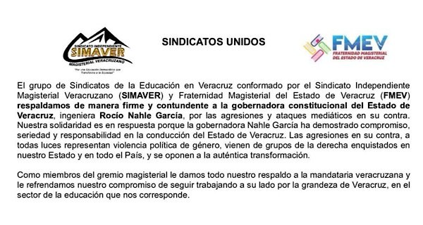 El manifiesto fue firmado por líderes del Sindicato Magisterial Veracruzano (SMV), el Sindicato Estatal de Trabajadores de la Educación en Veracruz (SETEV), el Sindicato LIDERAM y el Sindicato Unificador Magisterial (SUMA).