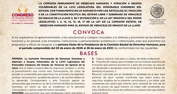 La Comisión Permanente de Derechos Humanos y Atención a Grupos Vulnerables de la LXVII Legislatura emitió la convocatoria pública para la designación de la persona titular de la Comisión Estatal de Derechos Humanos de Veracruz (CEDHV) para el periodo comprendido del 29 de enero de 2026 al 28 de enero de 2031.