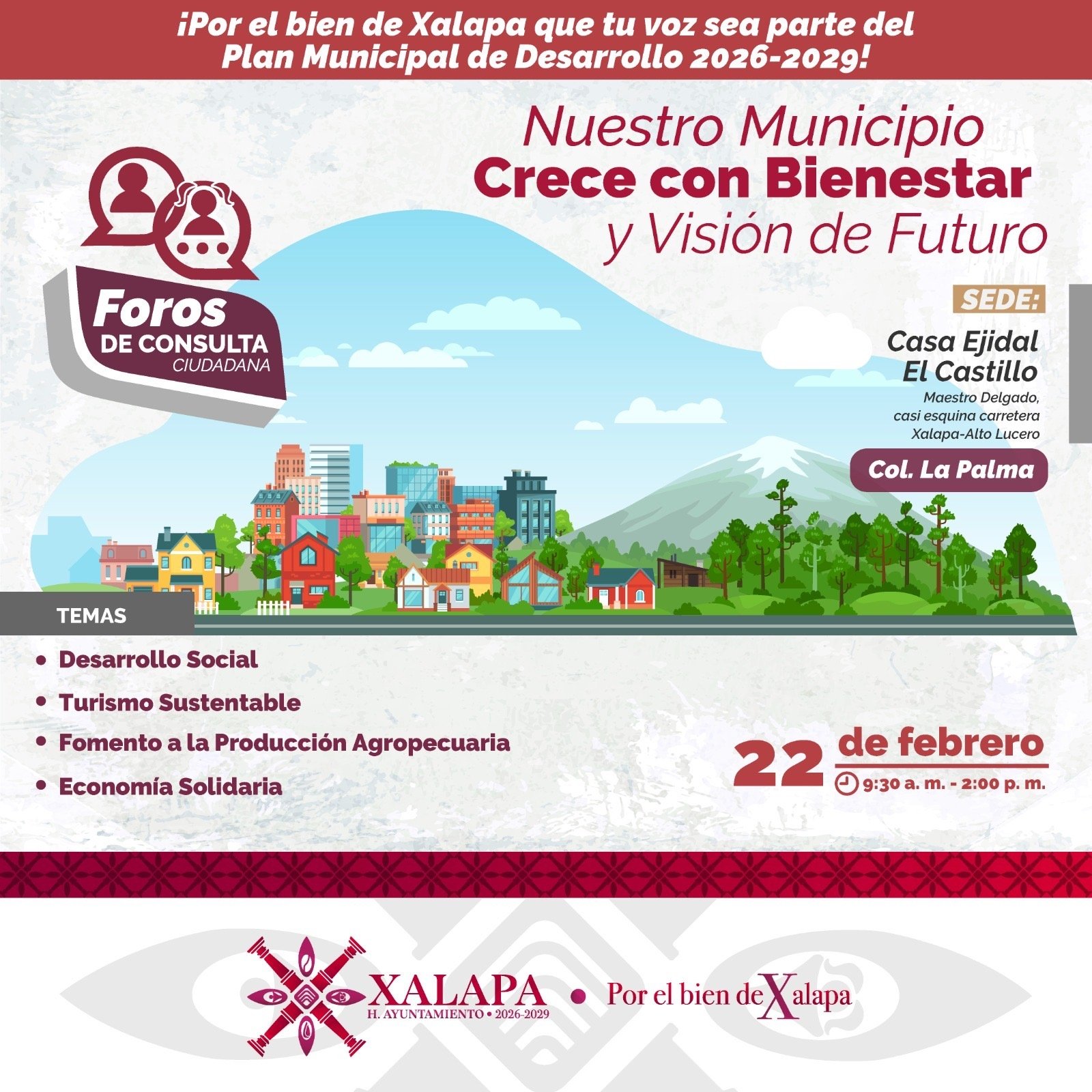 Xalapa, Ver., 3 de febrero de 2026.- Con el propósito de contar con un Plan Municipal de Desarrollo (PMD) que atienda las principales necesidades de la población y considere las propuestas de la sociedad, el próximo sábado 7 de febrero inician los foros de consulta para la elaboración del PMD 2026-2029.