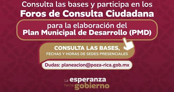 Poza Rica: Con el objetivo de fortalecer la participación social y construir un gobierno cercano, incluyente y transparente, el Gobierno de Poza Rica dio a conocer la convocatoria para participar en los Foros de Consulta Ciudadana rumbo a la elaboración del Plan Municipal de Desarrollo (PMD) 2026–2029.