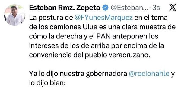 «La postura de @FYunesMarquez en el tema de los camiones Ulúa es una clara muestra de cómo la derecha y el PAN anteponen los intereses de los de arriba por encima de la conveniencia del pueblo veracruzano. Ya lo dijo nuestra gobernadora @rocionahle y lo dijo bien: En los gobiernos de Morena defendemos los derechos del pueblo y no de la clase empresarial.»