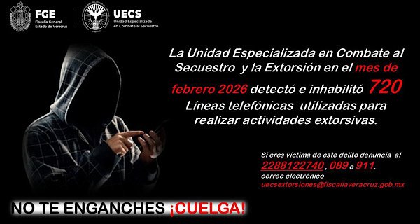 La Fiscalía General del Estado, a través de la Dirección General de la Unidad Especializada en Combate al Secuestro y la Extorsión (UECS), informa que durante febrero de 2026, fueron inhabilitadas 720 líneas telefónicas utilizadas por delincuentes para cometer extorsiones en el estado de Veracruz.