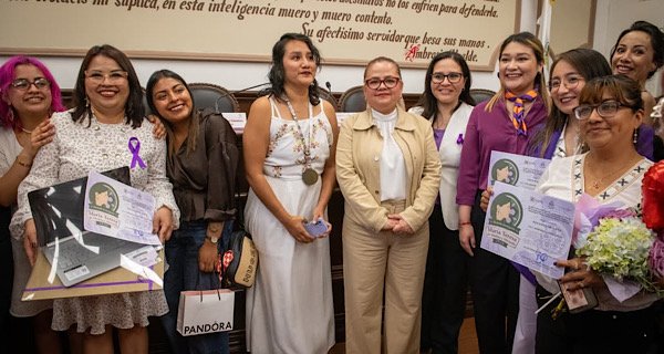 En el marco de la conmemoración del Día Internacional de la Mujer, ante el Síndico Único, Dr. Marco Aurelio Martínez Sánchez, y el Secretario del Ayuntamiento, Mtro. Víctor Hugo Meza Cruz, se otorgó la presea a María del Rosario Contreras Flores y Beu Ribe Yantlanesi Hernández Hernández, integrantes de Mujeres Sembrando Esperanza y la Colectiva de Familias Cuidadoras de Niñeces con Parálisis Cerebral y Neurodiversidad Funcional.