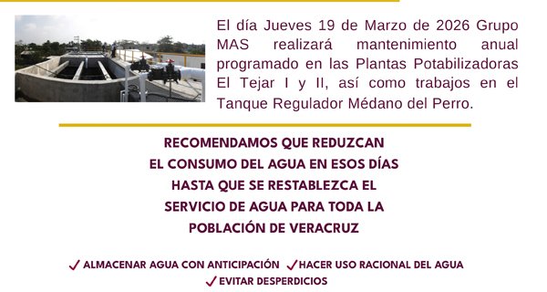 Debido al mantenimiento preventivo anual en las plantas potabilizadoras El Tejar I y II y en el tanque regulador Médano del Perro, el Instituto Metropolitano del Agua (IMA) exhorta a la ciudadanía a tomar previsiones ante la suspensión temporal del servicio de agua potable en toda la ciudad de Veracruz, el próximo jueves 19 de marzo, por lo que recomienda almacenar agua con anticipación y hacer un uso racional del vital líquido.