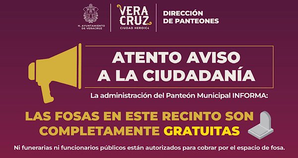 Debido a la detección de intentos de cobro indebido, el Ayuntamiento de Veracruz informa que las fosas en el Panteón Municipal son completamente gratuitas, por lo que nadie puede solicitar pagos por su asignación bajo ninguna circunstancia, garantizando un acceso digno y sin costo para las familias.