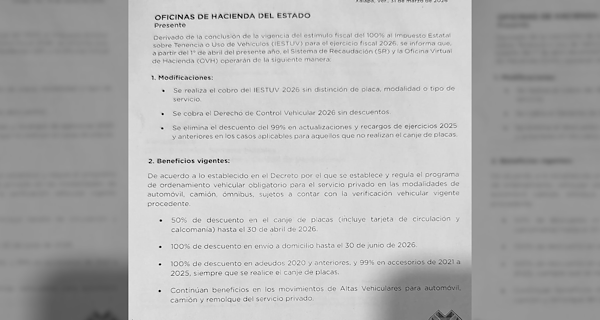 La Subdirectora de Registro y Control de Obligaciones, Edith Berenice Serrano, informó que concluyó la vigencia del estímulo fiscal del 100% al Impuesto Estatal sobre Tenencia o Uso de Vehículos (IESTUV) para el ejercicio 2026.