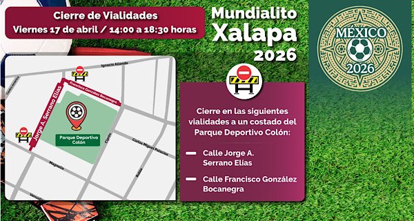 Ante el inicio del Mundialito Xalapa 2026, se informa a la población que el viernes 17 de abril habrá cortes a la circulación vial en la zona del Parque Deportivo Colón, por lo que se exhorta a automovilistas tomar rutas alternas y anticipar sus traslados.