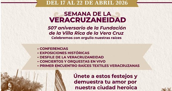 Con motivo de los 507 años de la fundación de la Villa Rica de la Vera Cruz, donde se estableció el primer ayuntamiento de México y del continente, el gobierno municipal de Veracruz presenta una semana de actividades culturales, artísticas y conmemorativas que celebran la identidad, historia y riqueza tradicional de la ciudad.