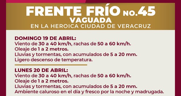 Debido a que durante este domingo 19 y lunes 20 de abril podrían presentarse vientos, lluvias y oleaje elevado por el paso del Frente Frío 45, la dirección de Protección Civil Municipal de Veracruz recomienda a la población tomar precauciones para evitar riesgos.