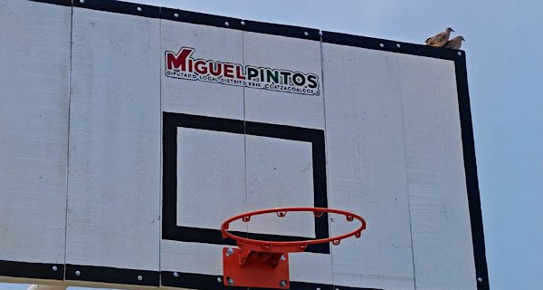 Sin embargo, en el tablero de la canasta fue colocado un letrero con su nombre y cargo, lo que implica la difusión personalizada de un servidor público en un espacio de uso común.