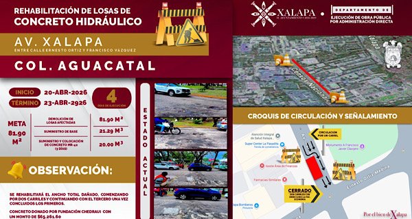 El Ayuntamiento de Xalapa informa que se mantiene el cierre parcial de la avenida Xalapa, en el tramo comprendido entre las calles Ernesto Ortiz Medina y Francisco Vázquez, en la colonia Aguacatal, debido a los trabajos de rehabilitación de losas de concreto hidráulico.