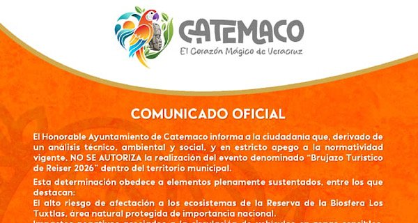 El Ayuntamiento de Catemaco informó que no autorizó la realización del evento denominado “Brujazo Turístico de Reiser 2026” dentro del territorio municipal, al argumentar razones técnicas, ambientales y sociales, además del apego a la normatividad vigente.