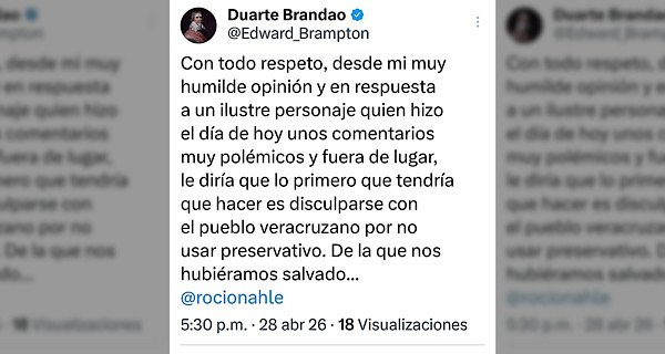 «Con todo respeto, desde muy humilde opinión y en respuesta a un ilustre personaje quien hizo el día de hoy unos comentarios muy polémicos y fuera de lugar, le diría que lo primero que tendría que hacer es disculparse con el pueblo veracruzano por no usar preservativo. ¡De la que nos hubiéramos salvado!», expresó.