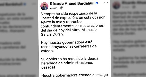 «Siempre he sido respetuoso de la libertad de expresión; en esta ocasión ejerzo la mía y repruebo contundentemente las declaraciones del día de hoy del Mtro. Atanasio García Durán», expresó la tarde de este martes a través de sus redes sociales.
