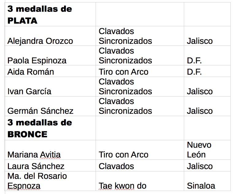 Ahora que si vemos de dónde fueron los deportistas que obtuvieron las 6 medallas olímpicas que México obtuvo (no considerando la de futbol, razón ya explicada) tenemos lo siguiente:
