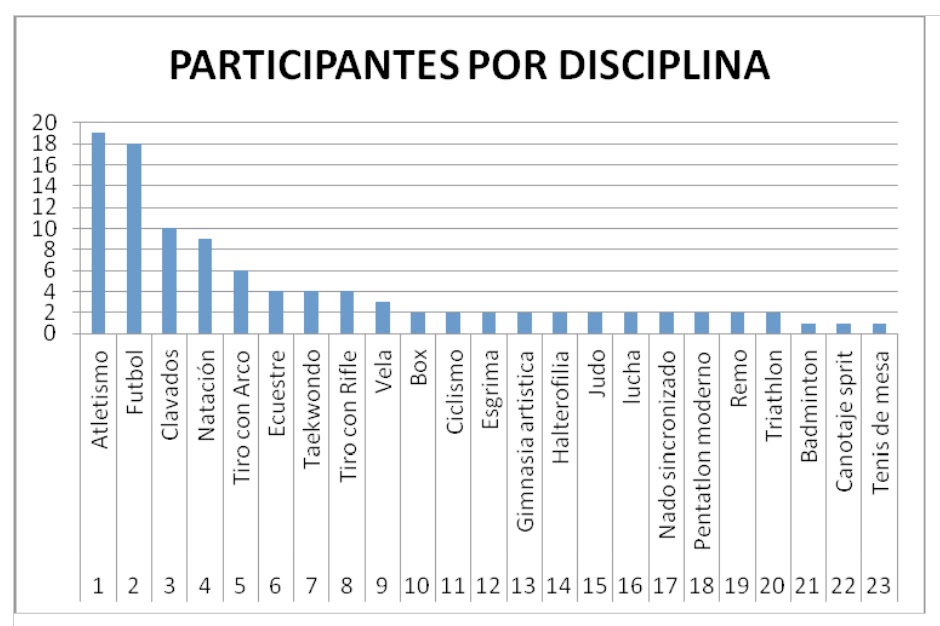 Luego entonces México participó en 23 disciplinas deportivas de las 36 de los Juegos Olímpicos de Londres, como se muestra a continuación: