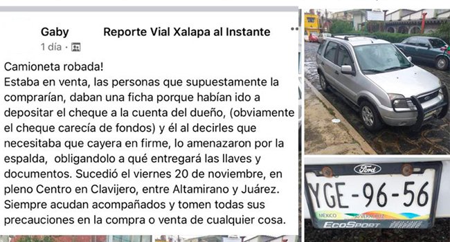 El pasado fin de semana, la usuaria de Facebook Gaby compartía tres fotos de una camioneta Ecosport color gris con placas de Veracruz YGE-96-56 junto con la siguiente leyenda: “¡Camioneta robada! Estaba en venta, las personas que supuestamente la comprarían, daban una ficha porque habían ido a depositar el cheque a la cuenta del dueño, (obviamente el cheque carecía de fondos) y él al decirles que necesitaba que cayera en firme, lo amenazaron por la espalda, obligándolo a que entregara las llaves y documentos. Sucedió el viernes 20 de noviembre, en pleno Centro en Clavijero, entre Altamirano y Juárez. Siempre acudan acompañados y tomen todas sus precauciones en la compra o venta de cualquier cosa”.