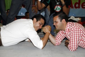 Américo y Carlos se tiraron al suelo, para tratar de hacer más equilibrada la justa de pulseadas.