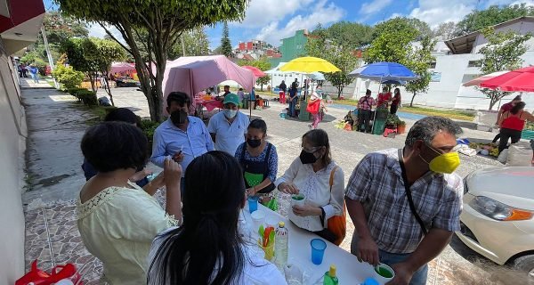 Guardando todas las medidas requeridas, por instrucciones del dirigente estatal Sergio Cadena Martínez, las brigadas encabezadas por la maestra Yolanda Rendón Hernández, secretaria de comunicación, recorren puntos de reunión como tianguis y parques de la ciudad para dialogar con las familias a quienes invitan a participar en la capacitación para la elaboración gel antibacterial con diferentes características, consistencias y aromas.